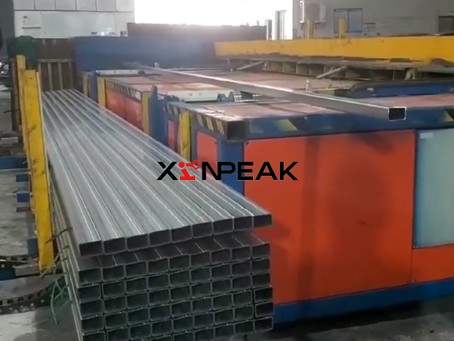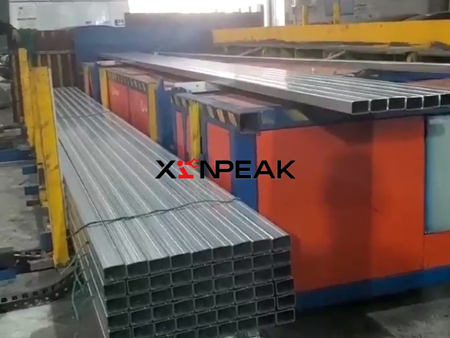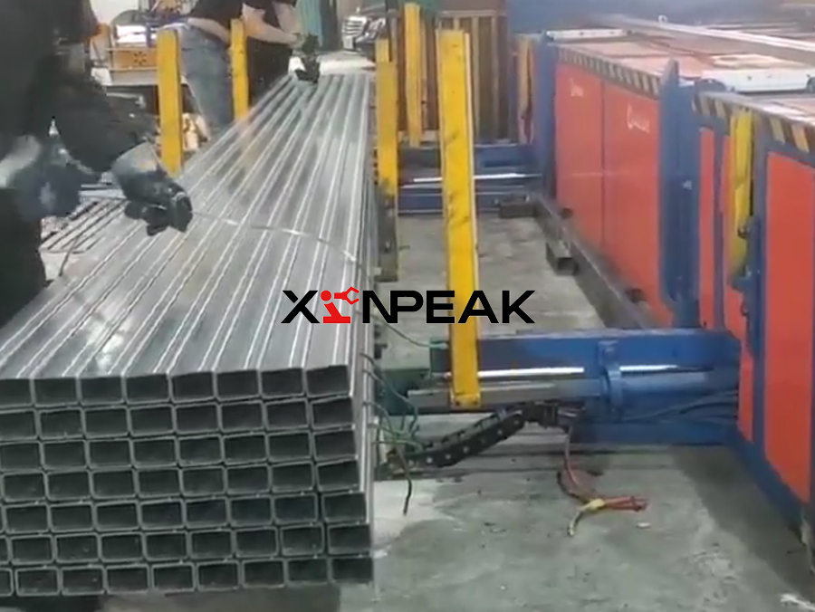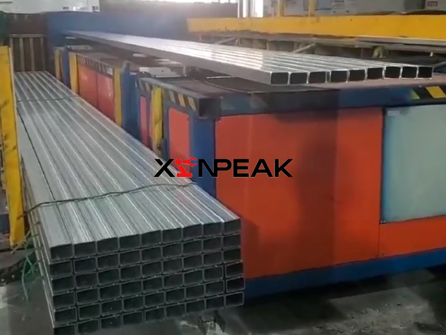 The simple palletizing machine system is used for automatic collection and palletizing of steel pipes. Its workflow is as follows: first, the steel pipes cut to the set length by a flying saw are transported by a conveyor frame and hit an inclined collision plate, causing them to roll onto the conveyor chain of the palletizing machine. Subsequently, the conveyor chain transports the steel pipe forward until it is stopped by the front baffle. The key step is completed by the flipping mechanism: when the steel pipe is sensed by the photoelectric switch, the flipping action will flip the entire layer of steel pipe forward to the stacking position below. Next, the fork arm mechanism intervenes to adjust the formed layer of steel pipes to the predetermined position and arrange them precisely in a hexagonal shape. The system repeats the above collection, flipping, and arrangement processes layer by layer. When the number of layers reaches the set value, a complete hexagonal tube package is formed. At this point, the palletizing and unpacking trolley carries the formed pipe packages out of the workstation and transports them to the designated unpacking point. Finally, workers manually pack the pipes and securely tie them with strapping straps for subsequent storage or transportation. The entire system achieves continuous collection, directional arrangement, and layered stacking of steel pipes through mechanical automation, significantly improving stacking efficiency and package regularity. Finally, manual bundling is used to complete factory preparation.